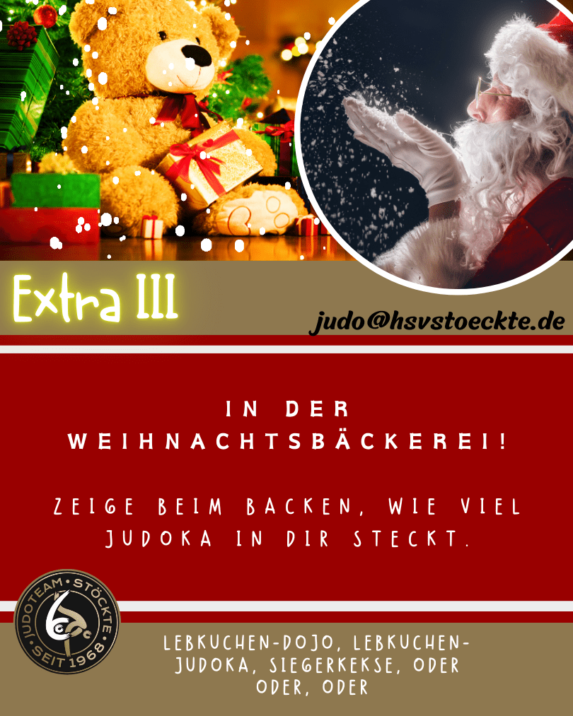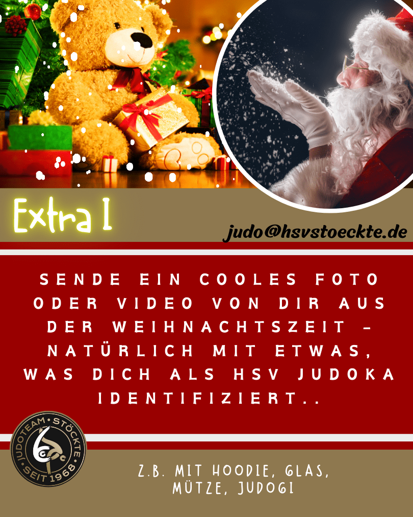 Neben dem Adventskalender gibt es drei Extra-Türchen für euch. Diese könnt ihr jederzeit in der Adventszeit öffnen. Zeigt beim Backen, Basteln, Singen oder Fotografieren, wie viel HSV-Judoka in euch steckt. Lade dein Video zu einem Extra-Türchen in die verlinkte Forms-Umfrage hoch. Wir freuen uns auf eure kreativen Ideen.